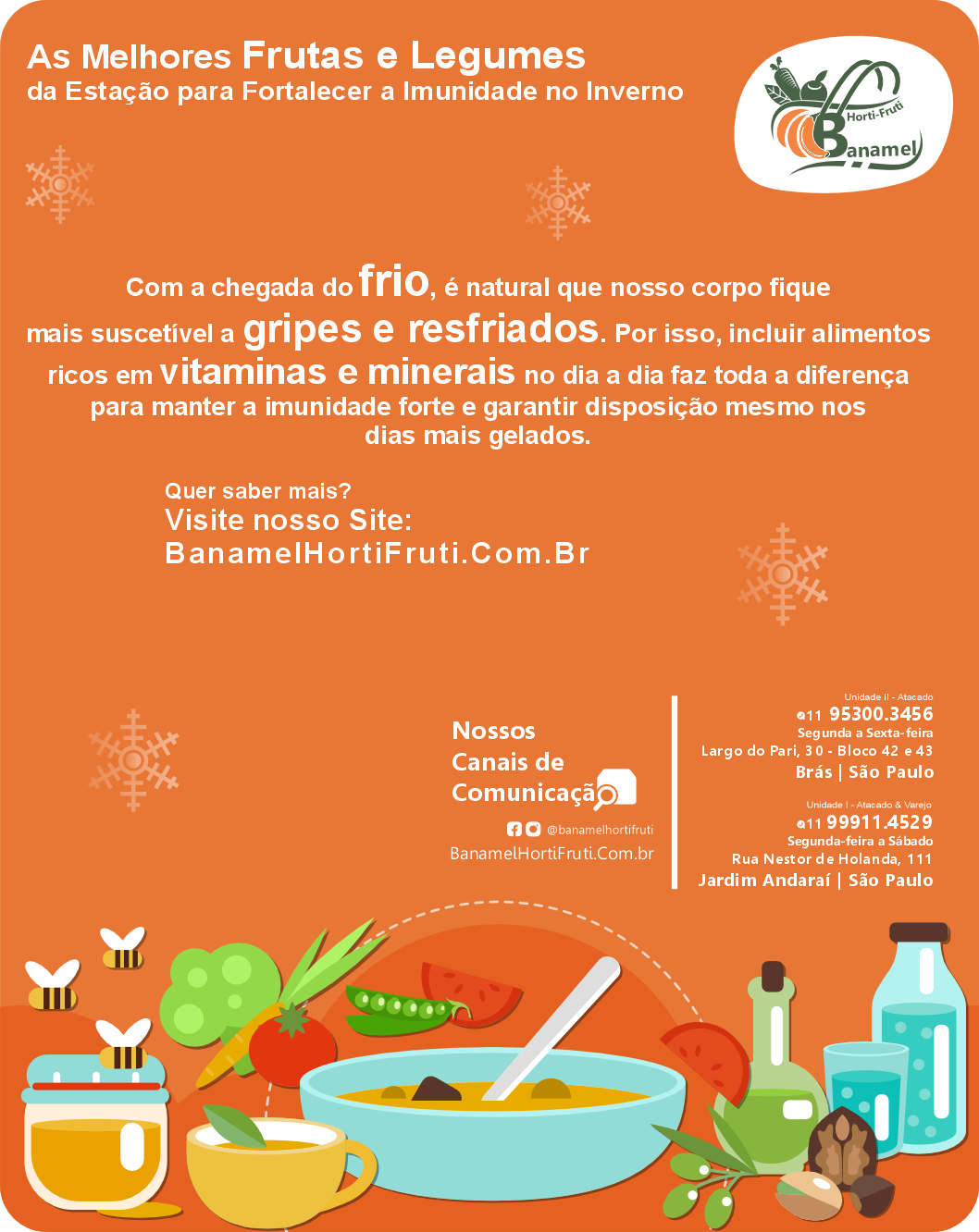Na Banamel, você encontra frutas e legumes fresquinhos, direto do campo, que são aliados poderosos da saúde durante o inverno. Confira algumas opções que não podem faltar no seu carrinho: