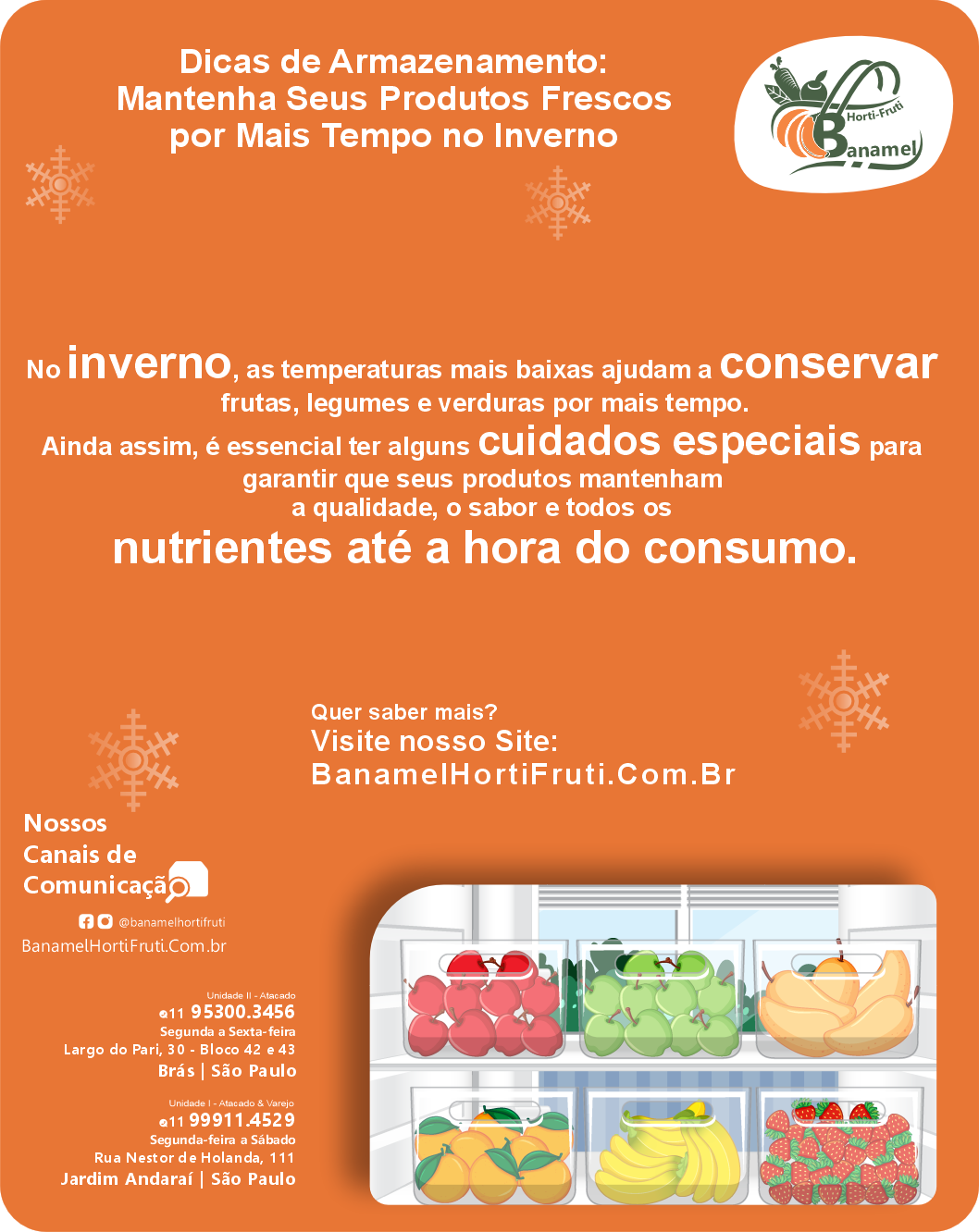 No inverno, as temperaturas mais baixas ajudam a conservar frutas, legumes e verduras por mais tempo. Ainda assim, é essencial ter alguns cuidados especiais para garantir que seus produtos mantenham a qualidade, o sabor e todos os nutrientes até a hora do consumo.